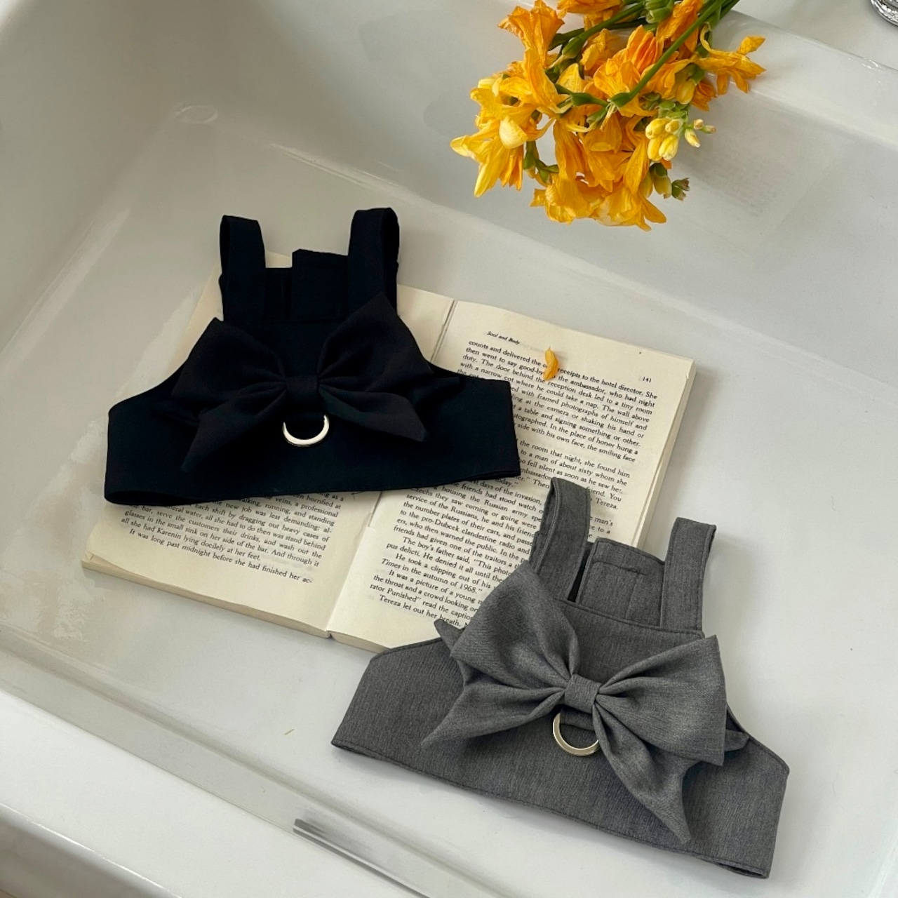 大胆な背中のリボンが印象的で、シンプルなトップスやワンピースに重ねるだけで、一気にこなれ感を演出。カラーはブラックとグレーの2色展開です♡