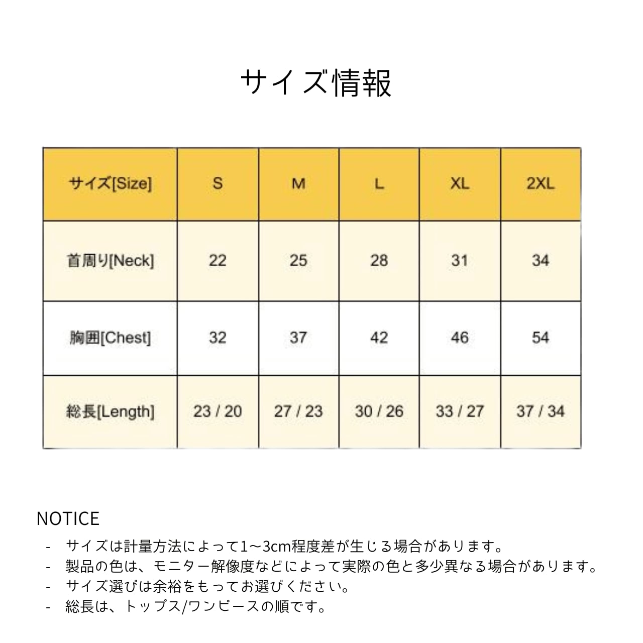 ・2XL:首周り 34cm 胸囲 54cm 背丈 37/34cm