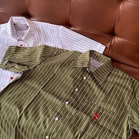 ブルーストライプに赤い刺繍ロゴ入りのポケットがアクセントになり、シンプルながらも抜け感と清潔感を演出してくれます。