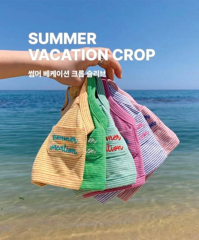 「summer vacation」の刺繍と小さなポケットがアクセントになった、爽やかで遊び心のある一着です。