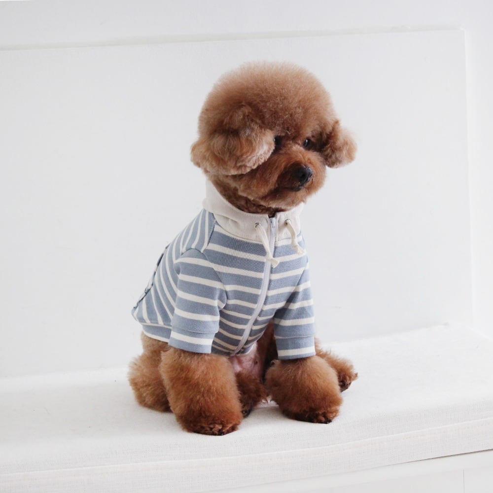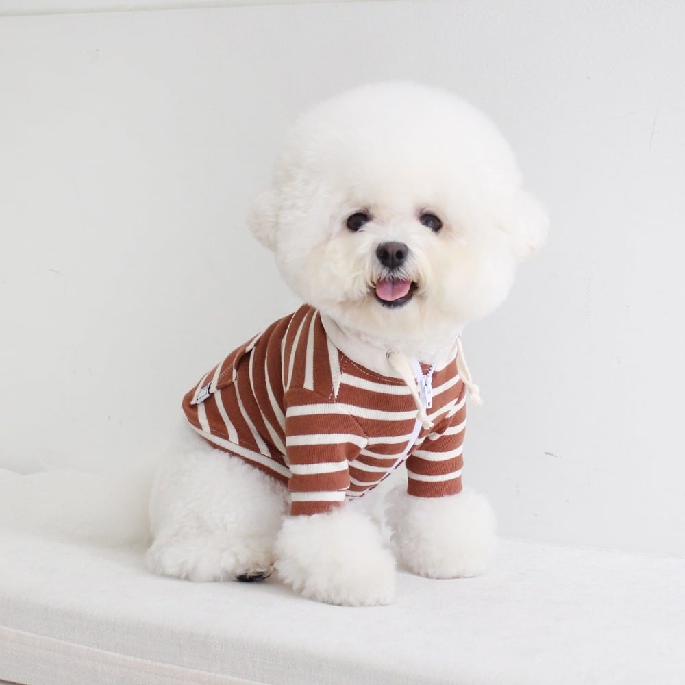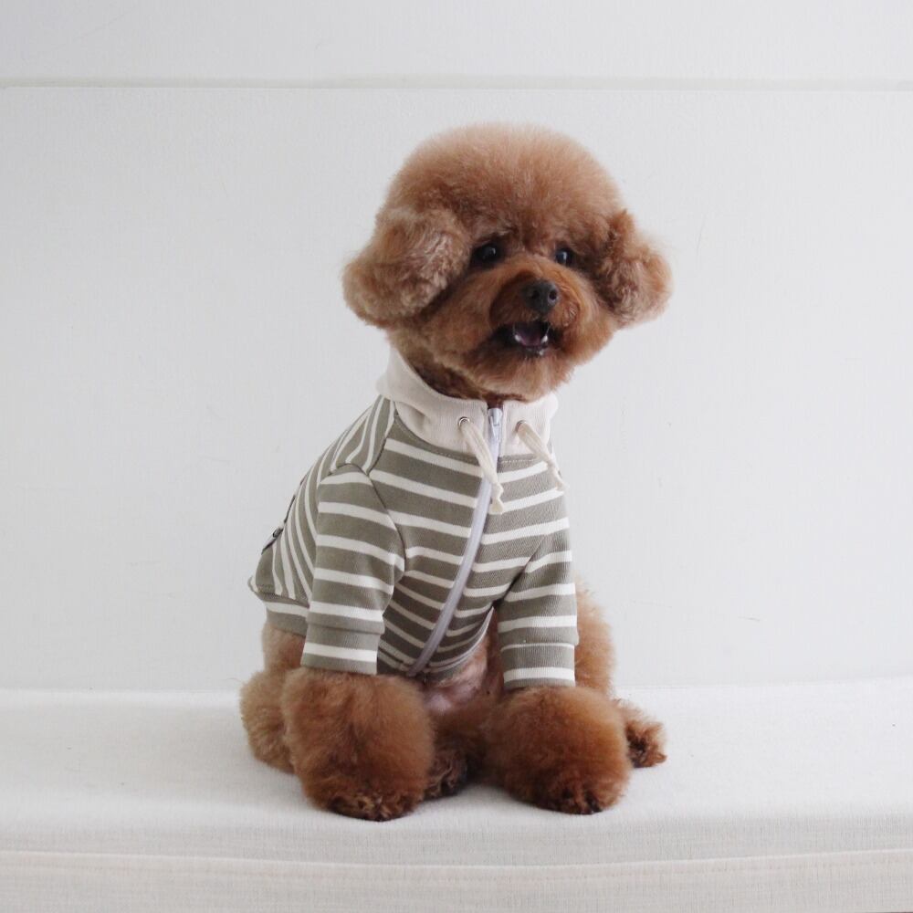 どんな毛色にもなじみやすい、やわらかなニュアンスカラーが魅力の秋限定ストライプフーディ。
